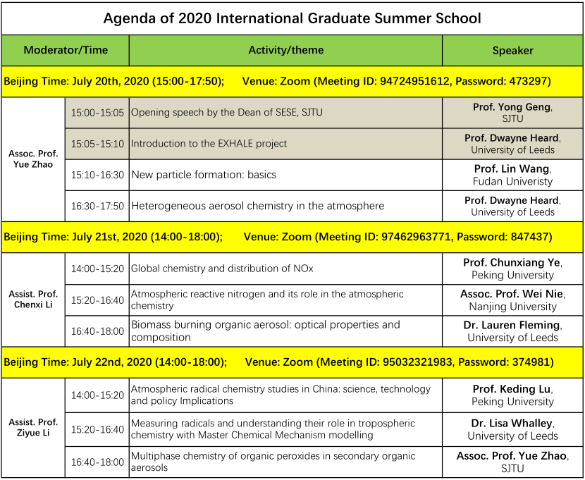 The 2020 International Graduate Summer School on Atmospheric Environmental Sciences will be jointly organized by the School of Environmental Science and Engineering of Shanghai Jiao Tong University and the School of Chemistry and School of Earth and Environment at the University of Leeds. The summer school offers a valuable opportunity for graduate students to expand their knowledge and deepen their understanding of atmospheric environmental sciences, especially fundamental air pollution chemistry, aerosol-planetary boundary layer interactions, air quality modeling, and the health and economic impacts of air pollution.