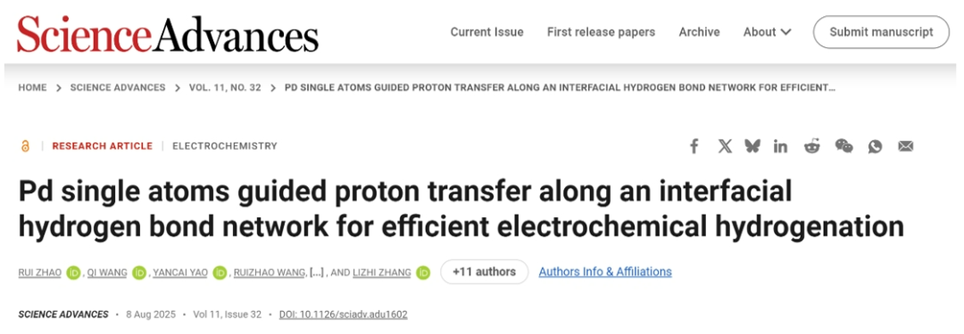 环院智慧|张礼知团队在Sci. Adv. 发文报道钯单原子诱导界面氢键网络质子转移及其高效电化学加氢