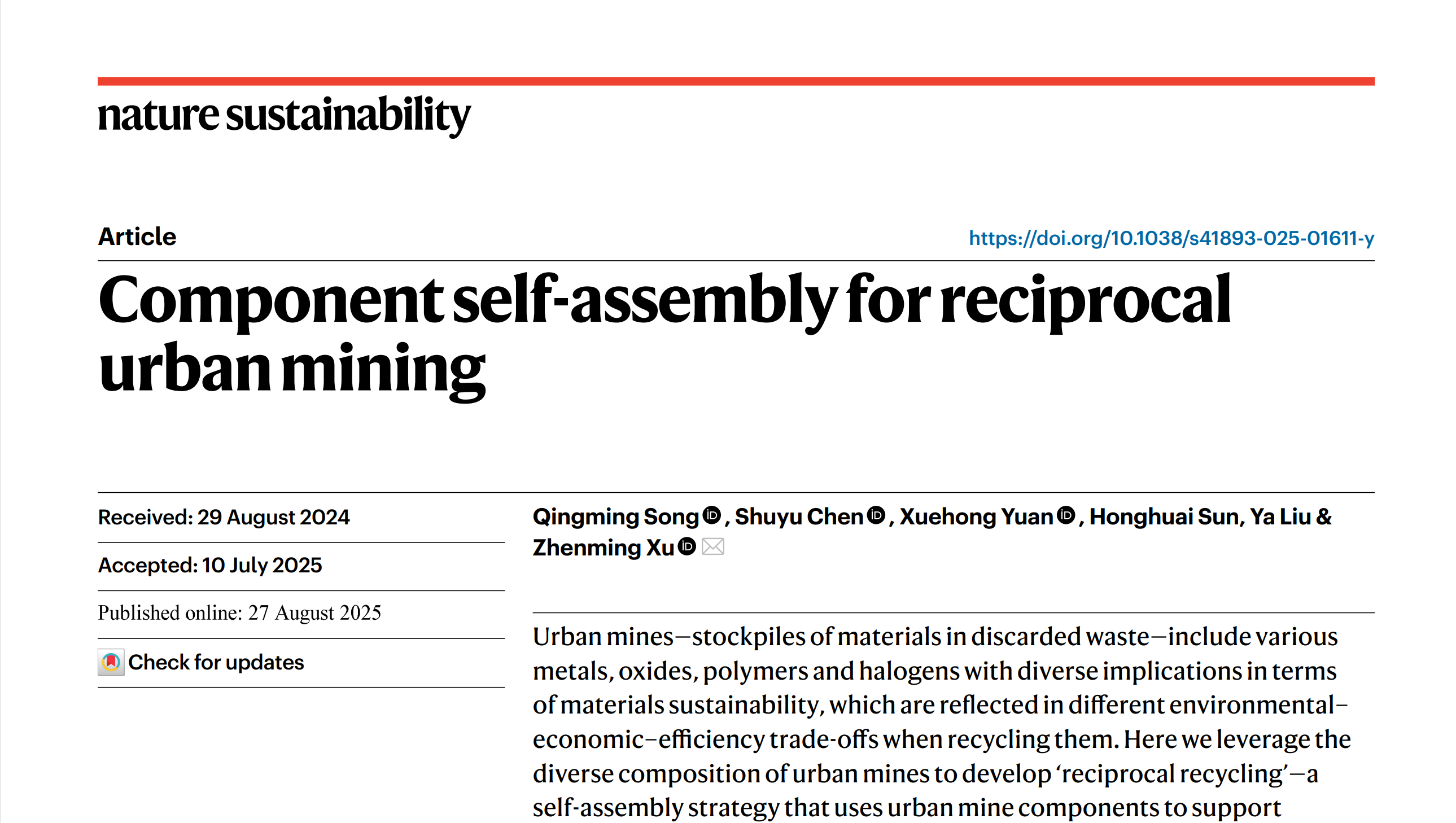 环院智慧|许振明团队Nature Sustainability发文提出城市矿产自组装互惠回收策略