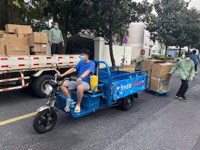 党员张帆为学校各核酸检测点位运送物资