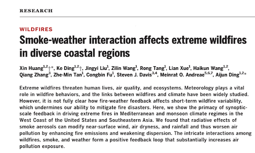 1. Huang X, Ding K, Liu J, Wang Z, Tang R, Xue L, Wang H, Zhang Q, Tan Z-M, Fu C, Davis S J, Andreae MO, Ding A, Smoke-weather interaction affects extreme wildfires in diverse coastal regions, Science, 379, 6631, 457-461, https://doi.org/10.1126/science.add9843, 2023.