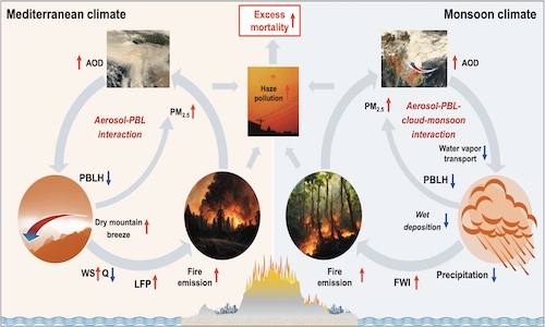 环境科学与工程学院2009届本科毕业校友黄昕教授及其团队最新研究发现,作为全球重要自然灾害的野火不仅受气象条件影响,而且其所排放气溶胶的辐射效应也可改变气象要素,由此产生天气尺度的正反馈机制显著增强全球不同沿海地区的极端野火事件。近日,论文“Smoke-weather interaction affects extreme wildfires in diverse coastal regions”以Research Article形式发表于《Science》杂志,并被作为同期亮点成果(Science, 379, 6631, 457-461 (2023), 论文链接:https://doi.org/10.1126/science.add9843)。该论文由我院2009届本科毕业校友黄昕教授作为联合第一作者和共同通讯作者。