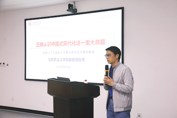 3月3日下午,环境科学与工程学院举办中国式现代化专题党课,特邀马克思主义学院陈亮副教授作题为“正确认识中国式现代化这一重大命题—党的二十大报告之中国式现代化专题的解读”专题讲座。学院党委中心组全体成员、师生党支部书记、支部委员、团学骨干等参加学习,党委书记胡薇薇主持会议。
