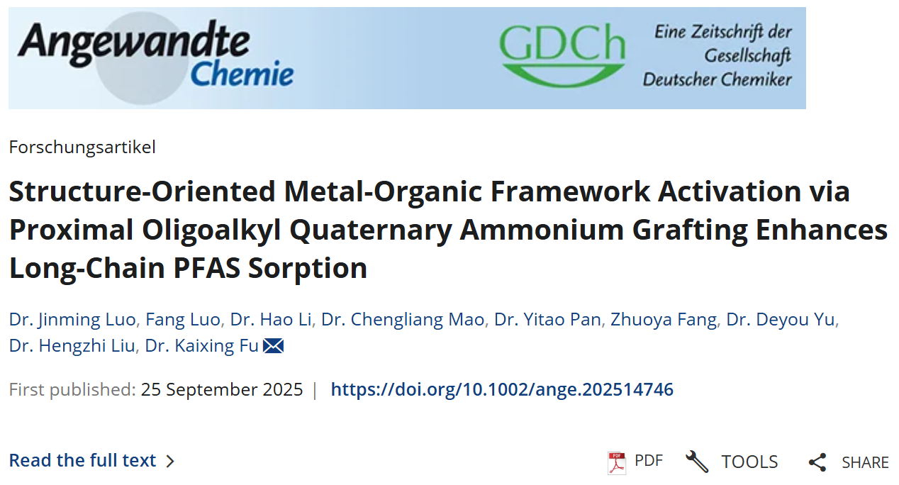 环院智慧|罗金明副研究员ANGEW发文:表面邻位烷基季胺盐低聚物局域修饰UiO-66-NH2高效去除水中长链PFAS及衍生物