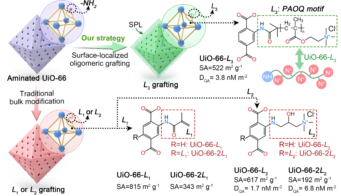 近日,上海交通大学环境科学与工程学院罗金明副研究员在《德国应用化学》(Angewandte Chemie)上发表了题为“Structure-Oriented Metal-Organic Framework Activation via Proximal Oligoalkyl Quaternary Ammonium Grafting Enhances Long-Chain PFAS Sorption”的研究成果。该研究成果突破传统MOF修饰局限,提出了一种表面局域化寡聚枝接策略,在UiO-66-NH₂表面精准构筑了邻近排列的寡聚烷基季铵盐(PAOQ)功能基元。该设计巧妙规避了MOF内部微孔的空间限制与传质壁垒,实现了功能基团负载量2.2倍的提升,并通过季铵盐与柔性烷基链的精确空间协同,实现了对长链PFAS的双模式高效捕获。