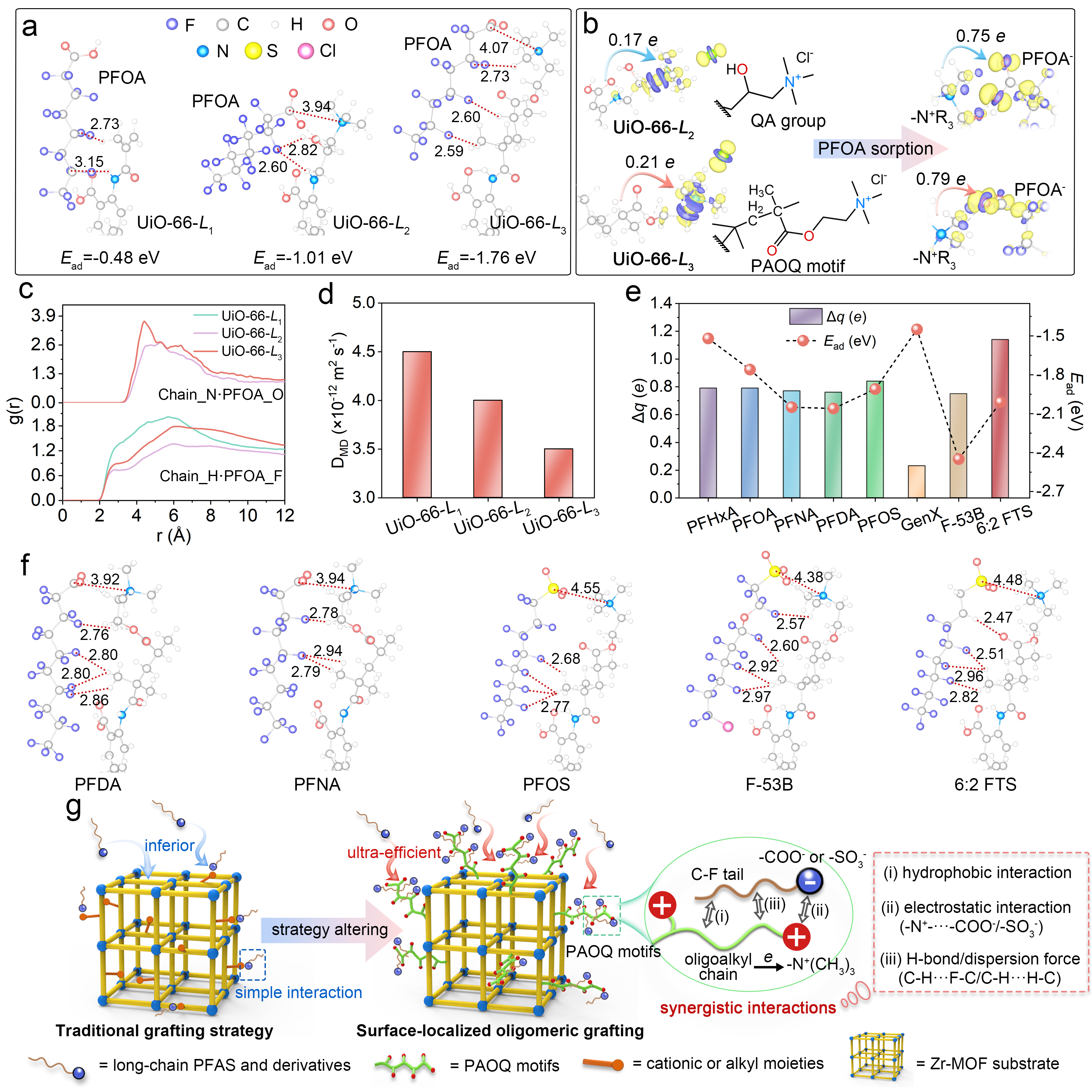 密度泛函理论计算从电子层面揭示了协同吸附机制。结果显示低聚烷基链通过σ键诱导电子向季铵中心转移(电荷转移量达0.21 e),显著增强其静电势能。PFOA在UiO-66-L₃上的吸附能低至-1.76 eV,远优于单一功能化材料。分子动力学模拟表明PFAS在材料表面呈现先静电吸引后疏水重排的双步吸附过程,扩散系数达3.5×10⁻¹² m²·s⁻¹。理论计算还发现吸附能与PFAS链长呈正相关,完美解释了材料对长链PFAS的选择性。