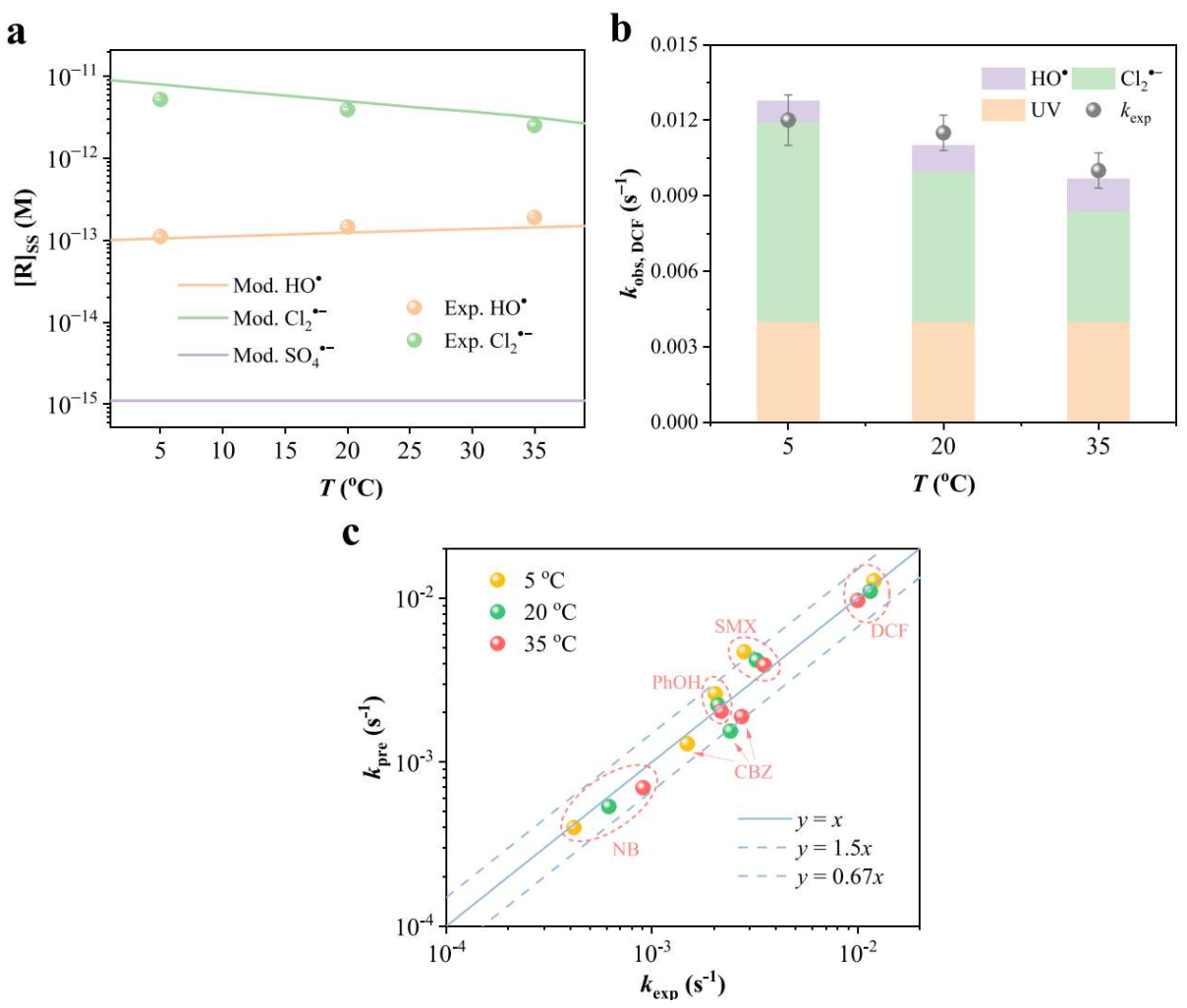 图4.(a)UV/PDS+Cl−体系中的自由基稳态浓度;(b)各类自由基及紫外光对双氯芬酸(DCF)降解的贡献。柱状图表示根据模型计算的自由基浓度所得的DCF降解速率,点表示实验测得的速率;(c)不同温度下微污染物的实验测得一级降解速率常数(kexp)与预测值(kpre)的相关关系。