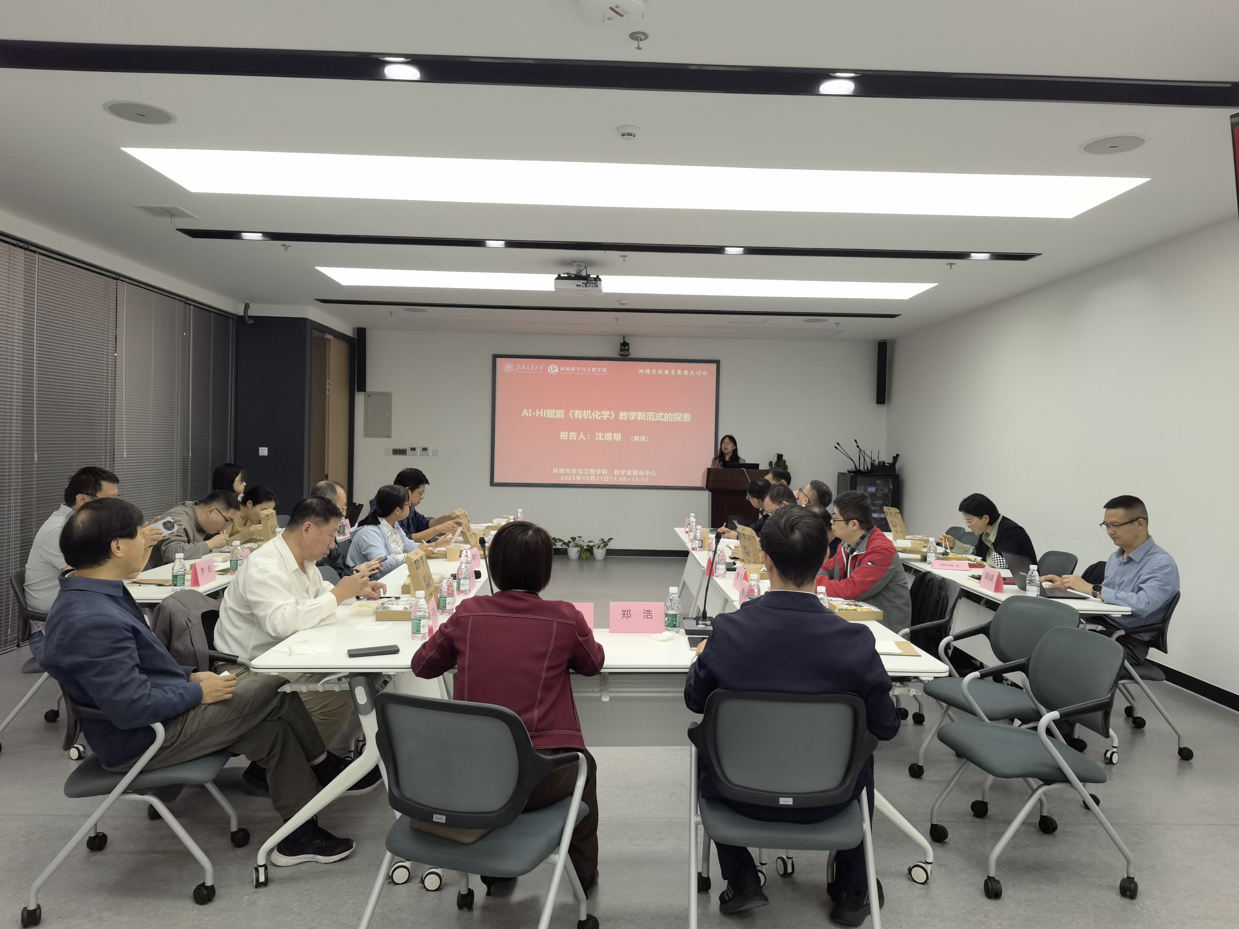 2025年10月21日,环境学院教学发展分中心邀请上海交通大学化学化工学院沈增明教授,开展“‘AI+HI’赋能《有机化学》教学新范式的探索”主题分享会,30余名专任课教师参与。本次活动作为环境学院开展教育思想大讨论系列活动之一,旨在探讨数字时代浪潮下,“AI+HI”为教育领域带来教学变革的新机遇、新要求,让新技术真正激活课堂、提升育人效能。