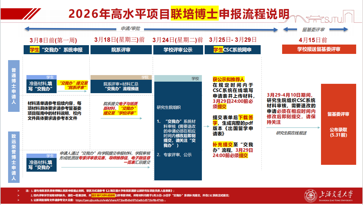 时间节点: 学生需于3月8日前,获得外方接收函(正式通知书或邀请信)、完成申报材料准备,并完成“交我办”系统申请。