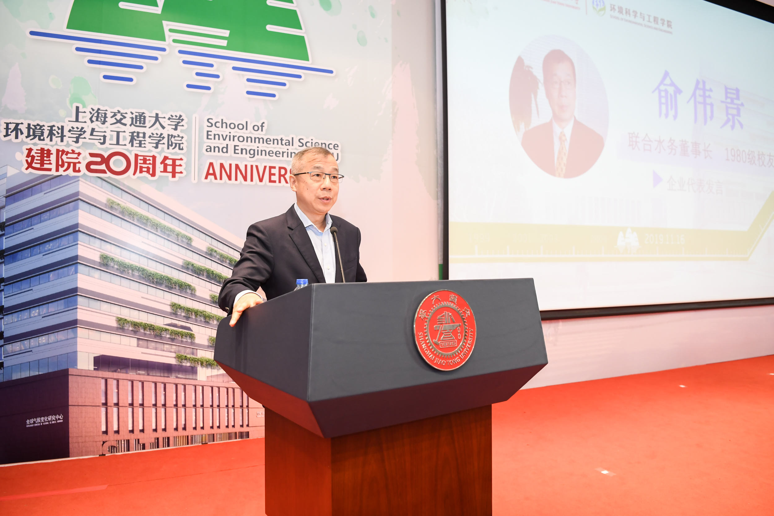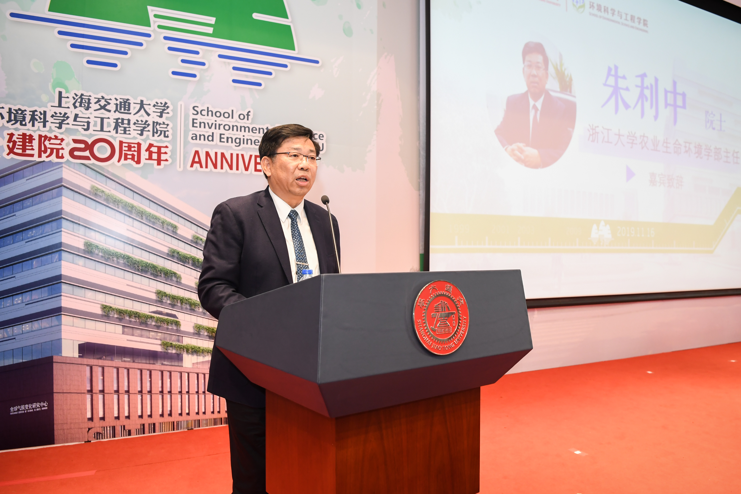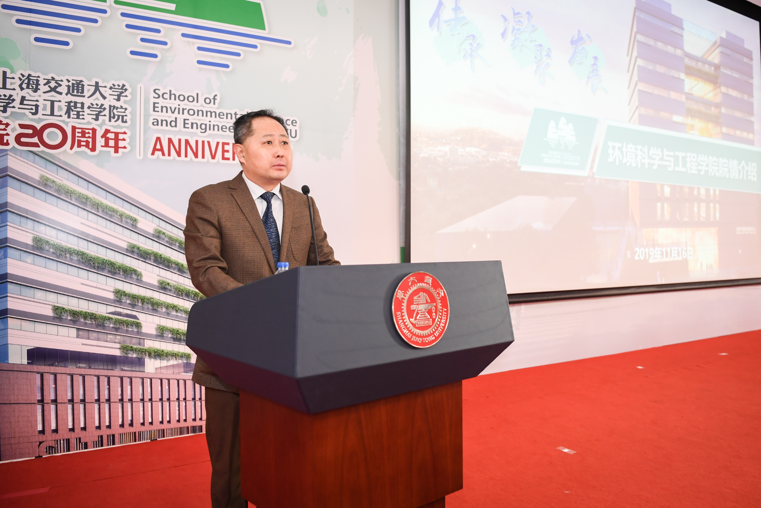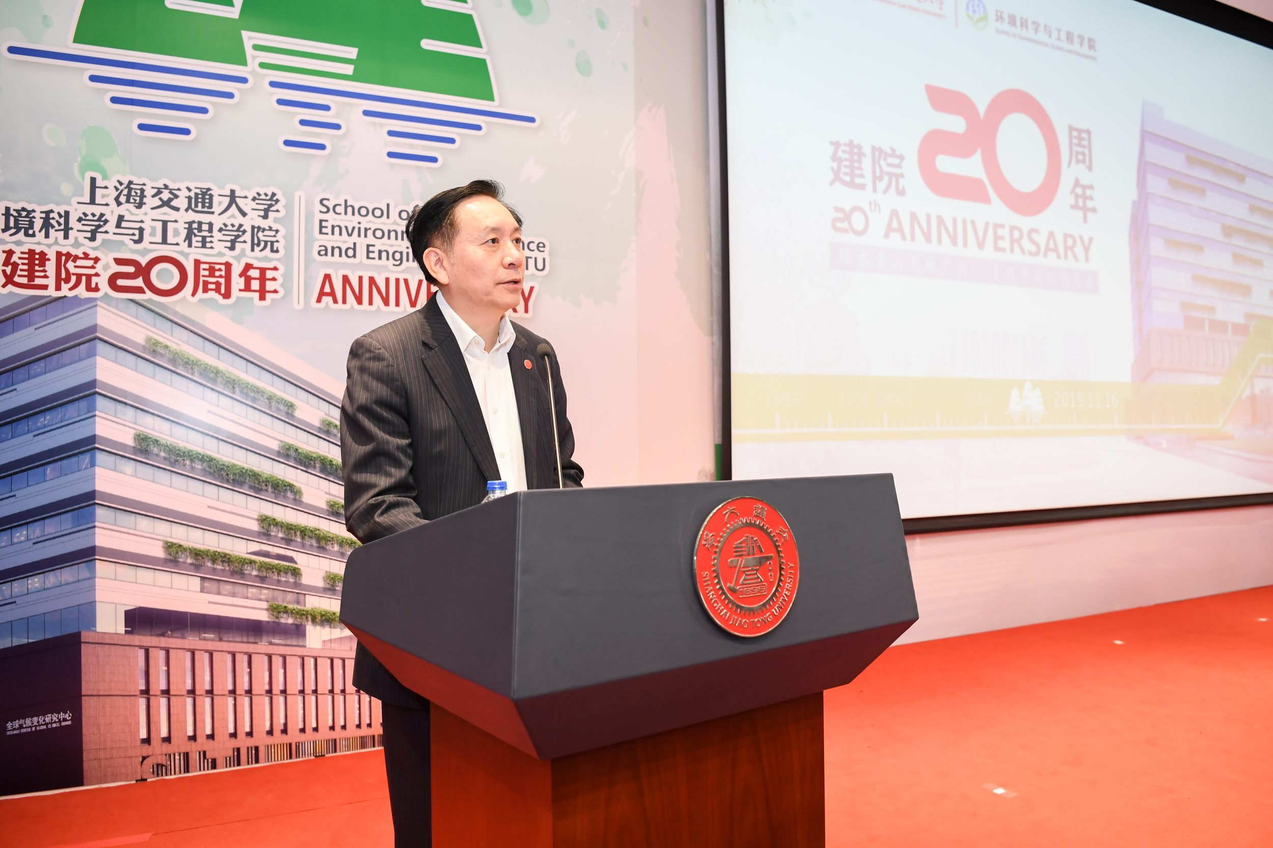 2019年11月16日,上海交通大学环境科学与工程学院建院二十周年庆祝大会在陈瑞球楼100号报告厅举行。上海交通大学党委书记姜斯宪,原党委书记王宗光,原党委书记马德秀,原校长谢绳武,学术委员会主任、中国科学院院士、原校长张杰,党委常委、副校长张安胜,校务委员会专职副主任、原副校长吴旦;中国科学院院士、天津大学刘丛强,中国工程院院士、浙江大学朱利中,中国科学院城市环境研究所党委书记朱永官,国际环境科学研究中心主席Douglas Evans,伦敦大学学院环境学院院长Raimund Bleischwitz,西安建筑科技大学环境与市政工程学院王晓昌,北京工业大学环境与能源学院陈标华,中山大学环境学院院长仇荣亮,南京大学环境学院毕军,中国科学技术大学化学与材料科学学院俞汉青,同济大学环境科学与工程学院副院长徐斌;中国水环境集团董事长侯锋,联合水务集团董事长、1980级校友俞伟景,上海申欣环保有限公司总经理徐建刚,联合国工发组织上海投资促进中心主任赵晓蕾,云南省环科院院长助理余艳红,上海市环保局综合规划处副处长、环境学院2001级校友汤庆合,上海依欧泽新能源科技有限公司董事长,1992级校友孙义;校内各兄弟院系及机关部处代表、校友代表;环境科学与工程学院退休教师、现任教师;以及环境科学与工程学院学生代表等五百余人参加了此次庆祝大会。大会由环境科学与工程学院党委书记胡薇薇主持。大会在庄严的国歌声中拉开序幕。