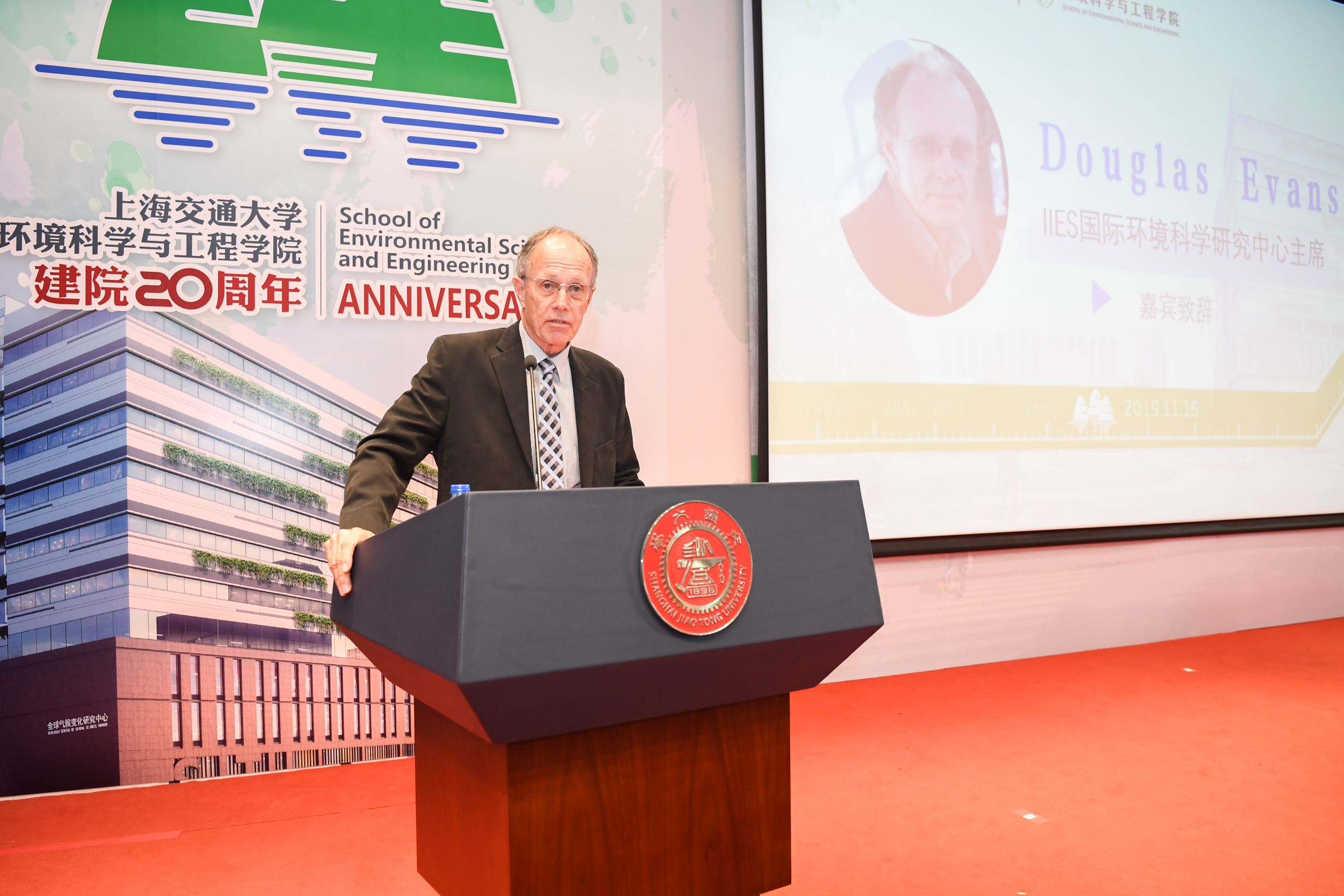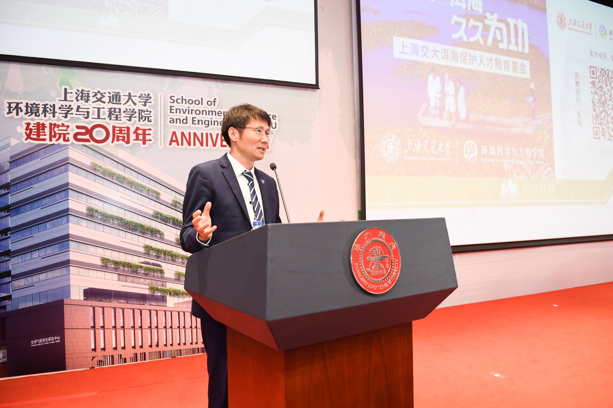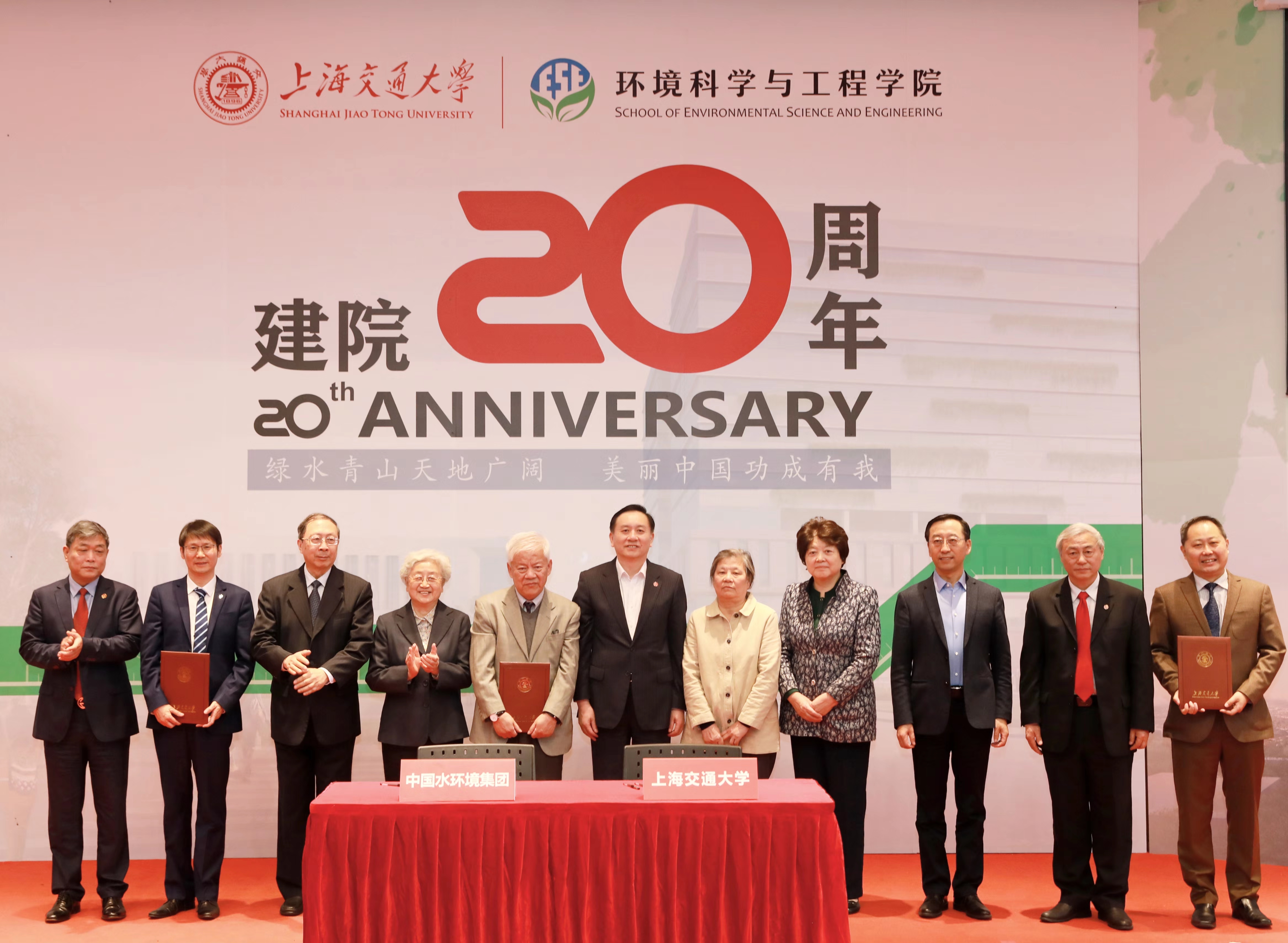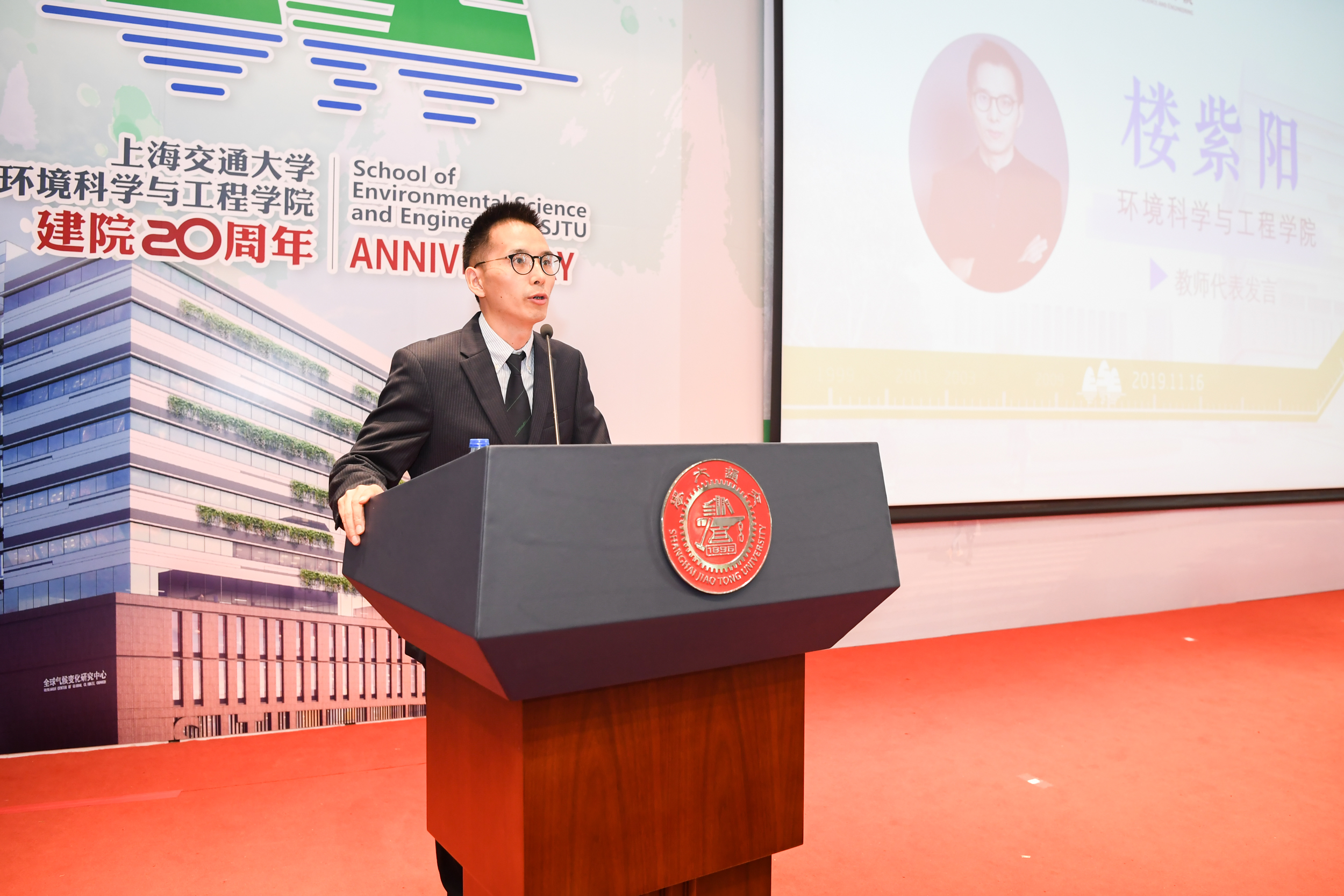 2019年11月16日,上海交通大学环境科学与工程学院建院二十周年庆祝大会在陈瑞球楼100号报告厅举行。上海交通大学党委书记姜斯宪,原党委书记王宗光,原党委书记马德秀,原校长谢绳武,学术委员会主任、中国科学院院士、原校长张杰,党委常委、副校长张安胜,校务委员会专职副主任、原副校长吴旦;中国科学院院士、天津大学刘丛强,中国工程院院士、浙江大学朱利中,中国科学院城市环境研究所党委书记朱永官,国际环境科学研究中心主席Douglas Evans,伦敦大学学院环境学院院长Raimund Bleischwitz,西安建筑科技大学环境与市政工程学院王晓昌,北京工业大学环境与能源学院陈标华,中山大学环境学院院长仇荣亮,南京大学环境学院毕军,中国科学技术大学化学与材料科学学院俞汉青,同济大学环境科学与工程学院副院长徐斌;中国水环境集团董事长侯锋,联合水务集团董事长、1980级校友俞伟景,上海申欣环保有限公司总经理徐建刚,联合国工发组织上海投资促进中心主任赵晓蕾,云南省环科院院长助理余艳红,上海市环保局综合规划处副处长、环境学院2001级校友汤庆合,上海依欧泽新能源科技有限公司董事长,1992级校友孙义;校内各兄弟院系及机关部处代表、校友代表;环境科学与工程学院退休教师、现任教师;以及环境科学与工程学院学生代表等五百余人参加了此次庆祝大会。大会由环境科学与工程学院党委书记胡薇薇主持。大会在庄严的国歌声中拉开序幕。