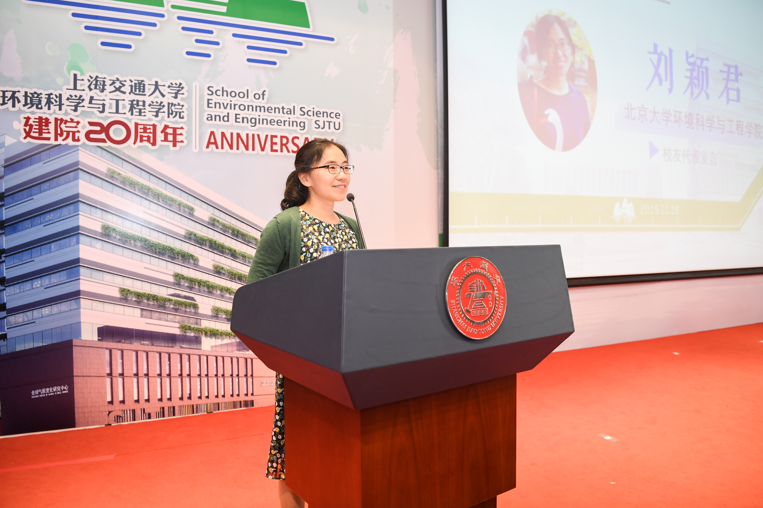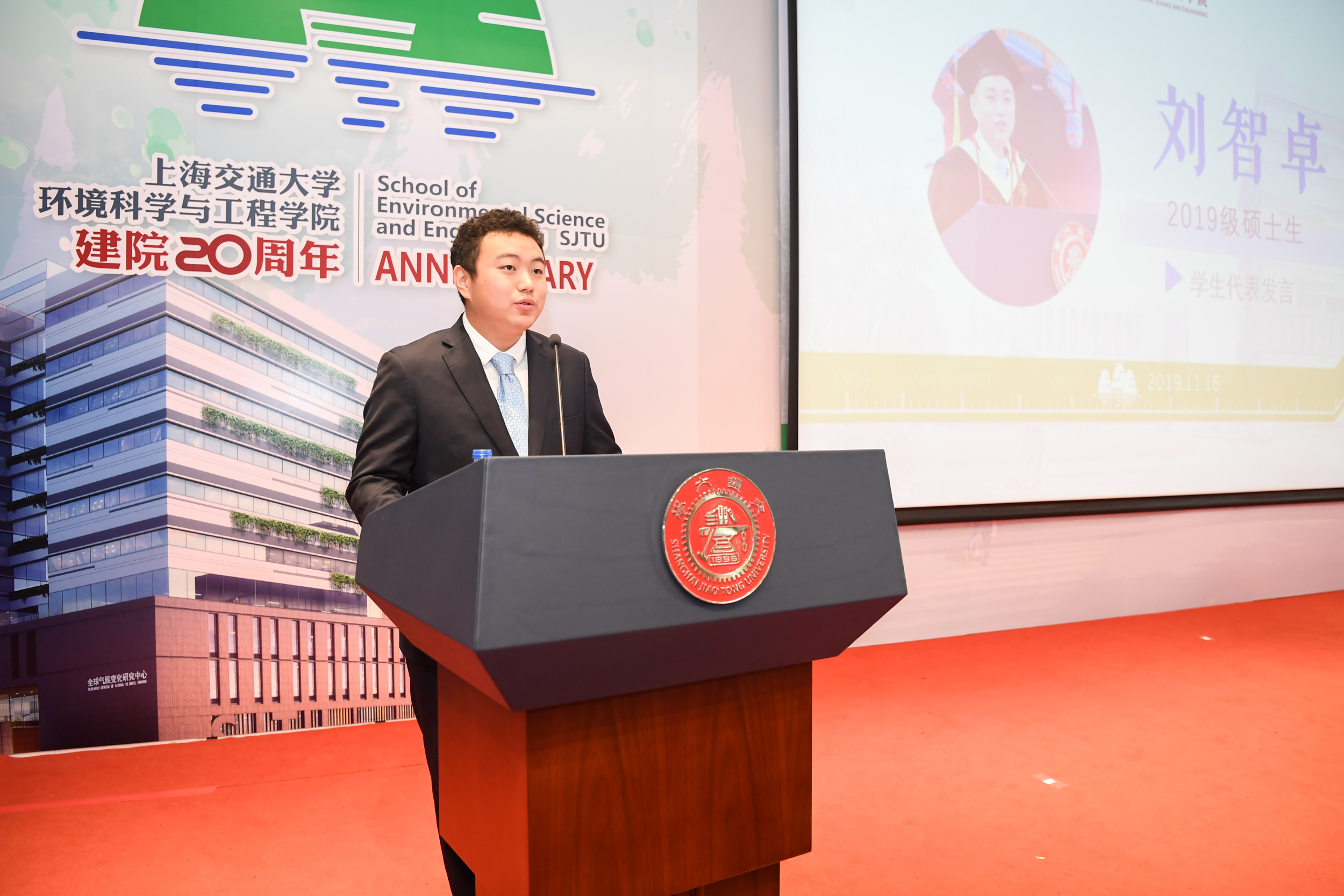 2015级本科生、2019级在读硕士研究生刘智卓作为在校生代表发言。他分享了在环境学院四年间学习生活的点滴记忆,刘智卓是绿格公益社团的创始人,正在上海交通大学对口扶贫的云南省洱源县支教,他也正在用自己的行动践行着交大环境人的初心与使命。三尺讲坛辛勤耕耘,呕心沥血教育新人,环境科学与工程学院教授楼紫阳作为青年教师代表发言,分享了自己作为青年教师在环境学院的成长发展过程,他表示,在当今生态文明建设的大潮中,年轻的环境人更需要担当,他相信,展望未来,环境学院一定既能承载百年学府的厚重与荣耀,更有信心为百年学府增添新的亮色。环境学院首届本科毕业生代表、国家青年特聘专家入选者,北京大学刘颖君研究员发言。刘颖君代表校友感谢环境学院一直以来的无私关爱和严格而全面的专业培养,她相信,每一位校友,都会谨记饮水思源、爱国荣校的校训,做好自己的本职工作,回馈学院的教诲和培养。上海交大1980级校友,联合水务董事长俞伟景学长作为企业代表发言。俞伟景对于环境学院二十周年院庆表达了衷心祝贺,并表示,希望与环境学院共同探讨院企合作研究创新的环保技术,将市场需求与科学研究结合,推动中国环保行业的创新发展。