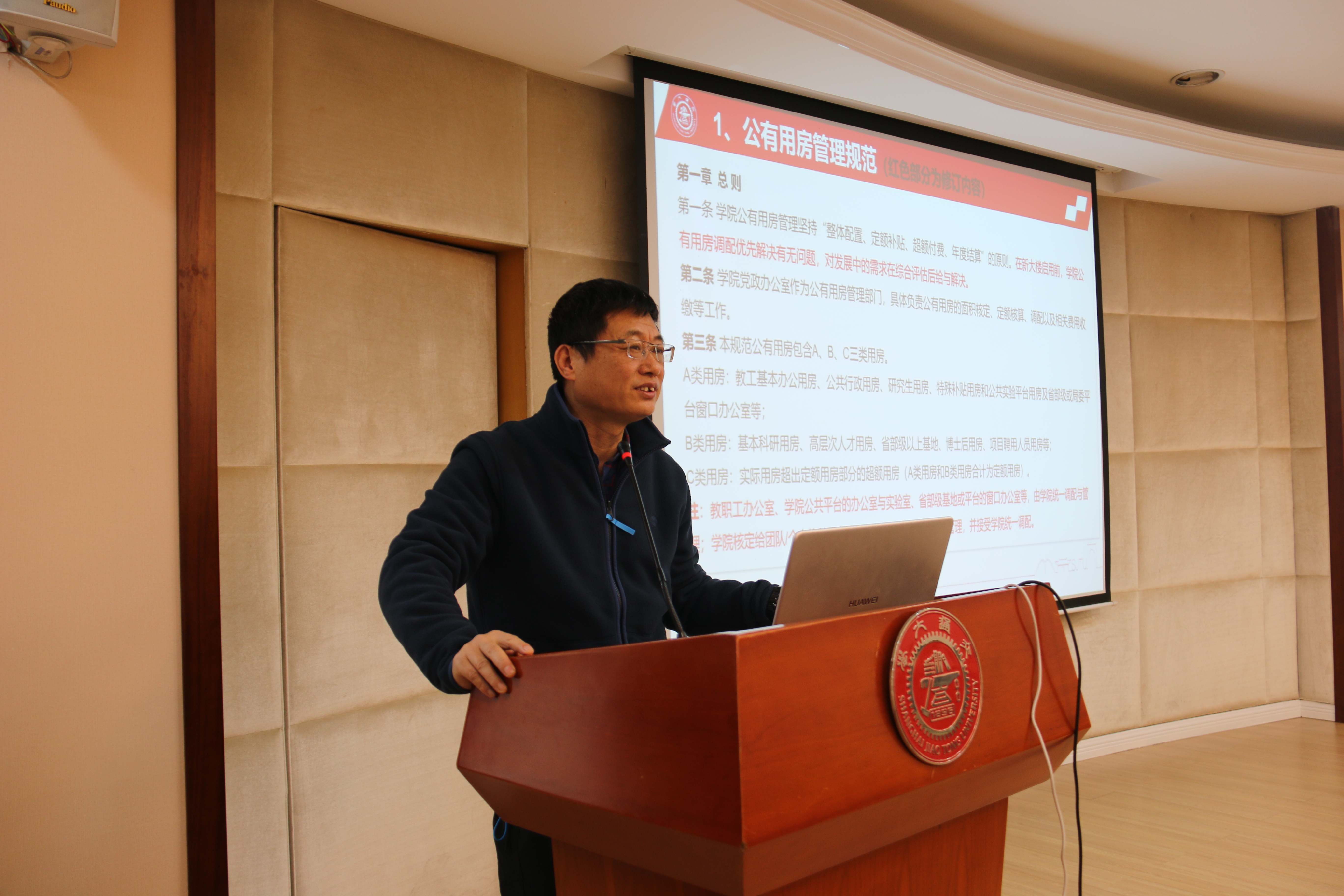副院长许振明向与会人员介绍了环境科学与工程学院公有用房管理规范、实验室安全管理奖惩机制及实验室大型仪器设备资源共享管理办法。