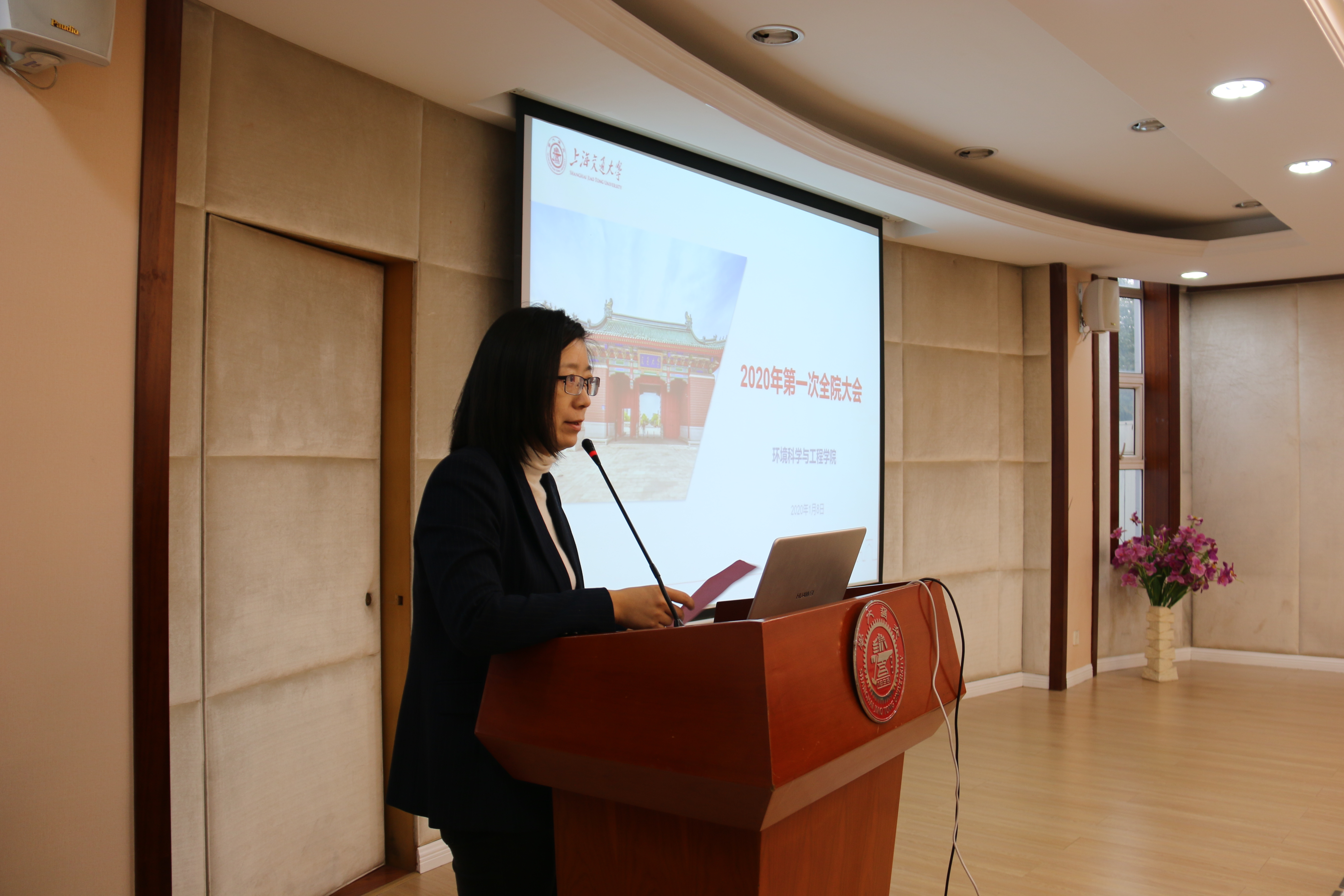 1月8日上午,环境科学与工程学院2020年度第一次全院大会在学院报告厅召开,学院党政领导班子、全体教职工参会,会议由党委书记胡薇薇主持。