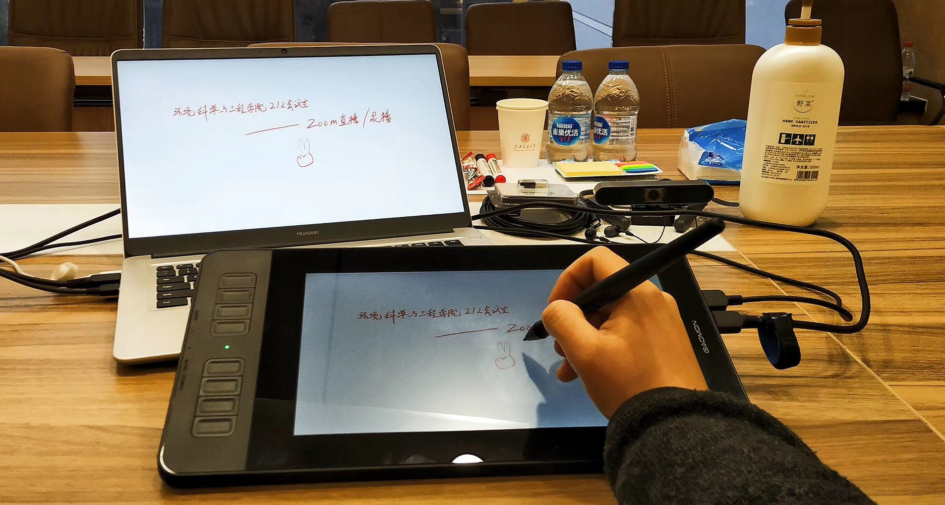 为保证线上教学质量,学院第一时间建立了在线课程建设工作群和课程助教群。任课教师和助教同学参加了学校组织的各类培训与试讲观摩,掌握了在线教学的基本技能和形式要求。同时,学院针对主讲教师、助教、督导等组织了多轮培训,由在线教学技术支持徐臻老师专门指导,共同探讨和解决在线教育中遇到的各类问题。为提升在线教学效果,学院提前排摸师生网络和设备情况,组织在线课程试讲,评估在线课程教学方案,组织2月24-28日期间的预讲演练。学院还准备了三间会议室供老师授课使用,配备了摄像头、麦克风、绿幕、手绘屏等在线授课常用设备。
