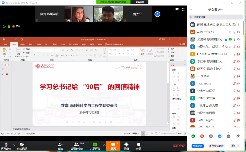 在全国上下戮力同心抗击新冠肺炎之际,为深入贯彻落实习近平新时代中国特色社会主义思想,继续引领学生党员发挥先进模范带头作用,4月21日中午12点,环境学院召开2020年春季学期学生党建工作第一次线上视频会议。环境学院党委副书记陈哲、团委书记汤淏溟出席本次会议,一百多名学生党员和积极分子参加了此次会议。会议由组织员马青主持。