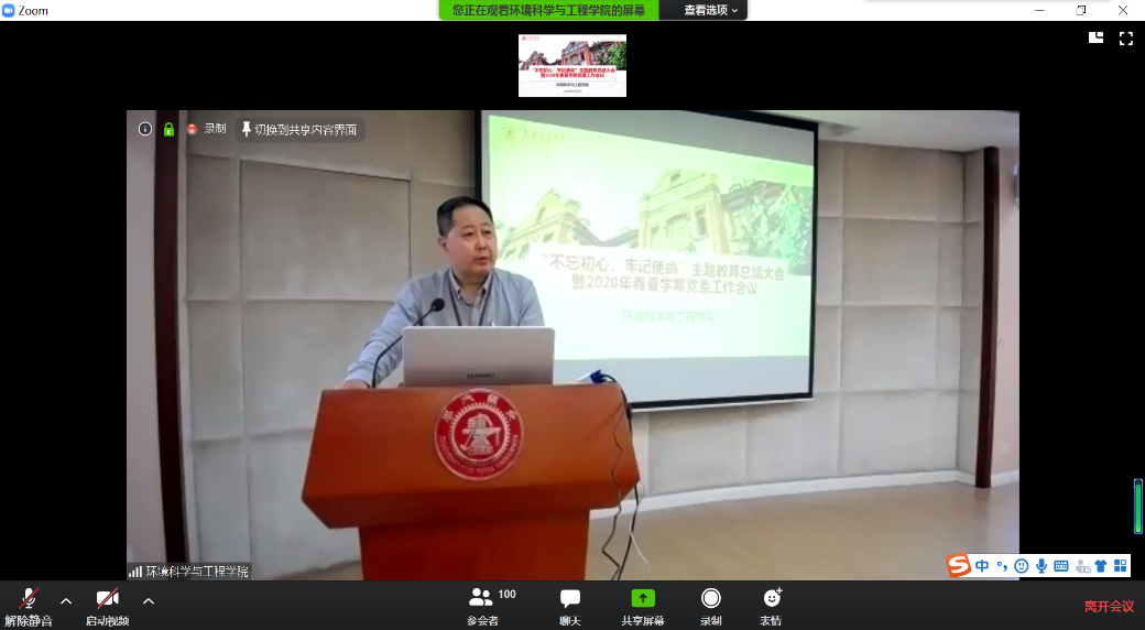 5月7日下午,环境学院召开“不忘初心、牢记使命”主题教育总结大会。会议主会场在环境楼二楼报告厅和ZOOM线上会议室同步进行,学院党政领导班子、党委委员、全体师生党员等100余人参加了会议。会议由院长耿涌主持。